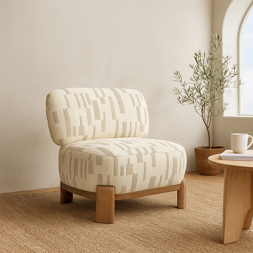 A low, sculptural Accent chair with calm, coastal energy. Nest pairs a plush, wide seat with a soft pillow-back cushion (subtle gap detail) and a warm solid-wood base with block legs. Upholstered in cream textured jacquard with a refined geometric weave, it’s an easy accent/reading chair that brings Scandinavian/Japandi serenity to modern Indian homes.