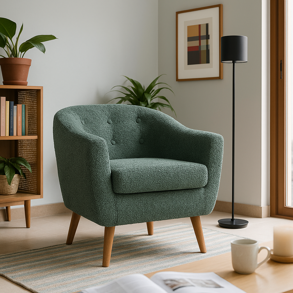 A cozy Accent chair with timeless mid-century curves. Siena combines a gently tub-shaped back, loose seat cushion, and subtle button tufting with warm tapered solid-wood legs. Upholstered in plush forest-green bouclé (teddy) fabric, it delivers the look and feel customers want in a modern accent/reading chair for Indian homes.