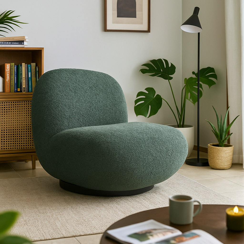 A modern lounge chair with a sculptural, pebble-like silhouette that softens any space. Upholstered in tactile bouclé (teddy) fabric in a calming moss-green, the Zane’s armless, deep seat and low, cocooning back make it a perfect reading chair and a stylish accent chair for contemporary homes. The minimal black plinth base grounds the form, keeping the profile clean and gallery-worthy.