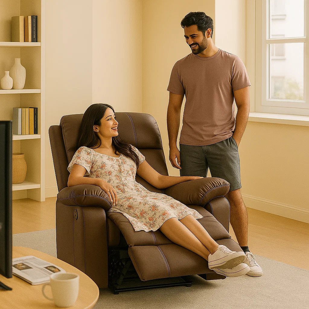 The rich & earthy mocha brown tone adds warmth and elegance, while the smooth reclining action adapts effortlessly to your relaxation posture. Ideal for living rooms, dens, or media spaces, this recliner combines sleek design with durable craftsmanship.