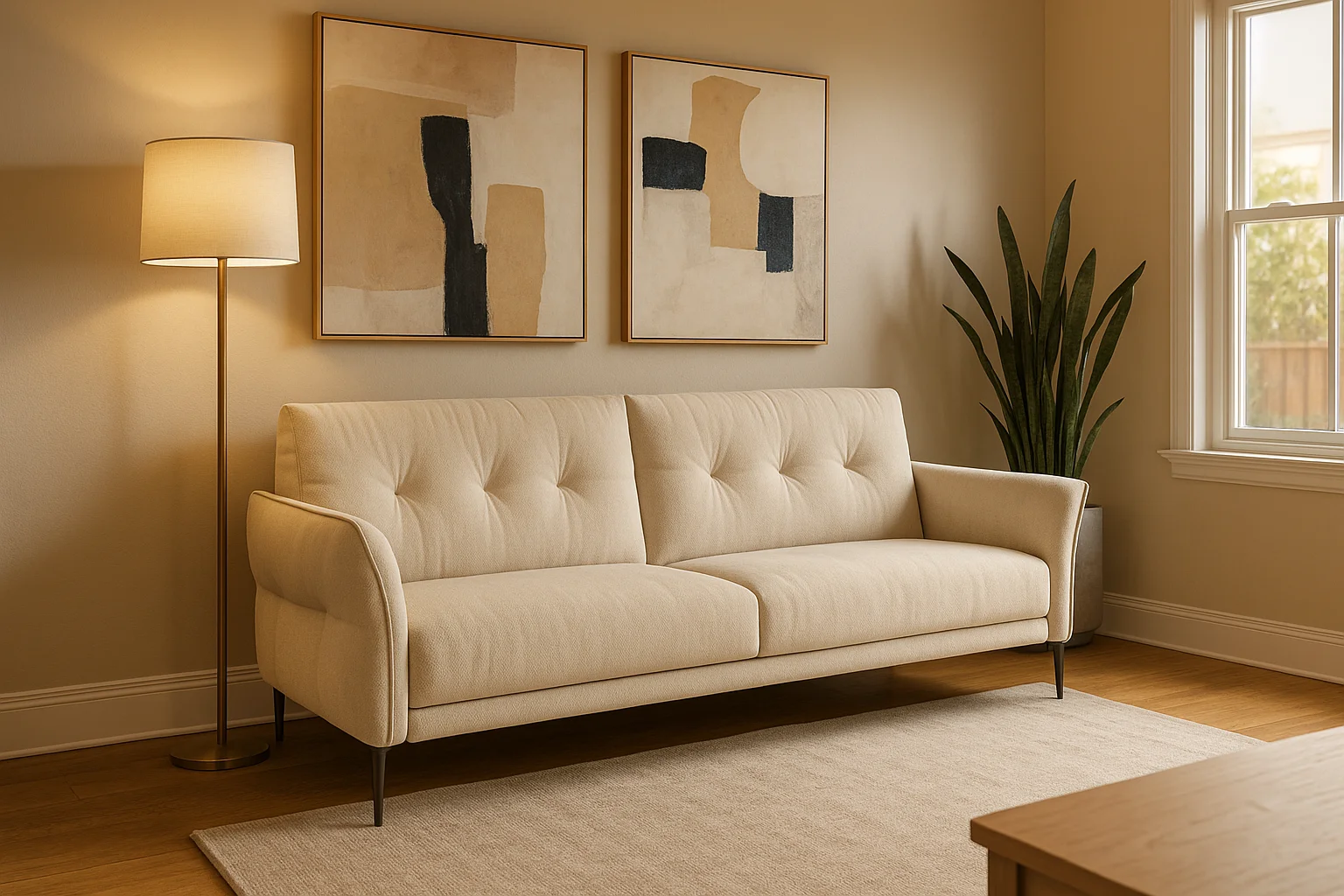 ✅ Textured Elegance in Fabric: Upholstered in a soft, sand-beige textured fabric with subtle tufted detailing, the Ansel sofa blends tactile warmth with a clean, tailored profile — perfect for elevated minimalism.