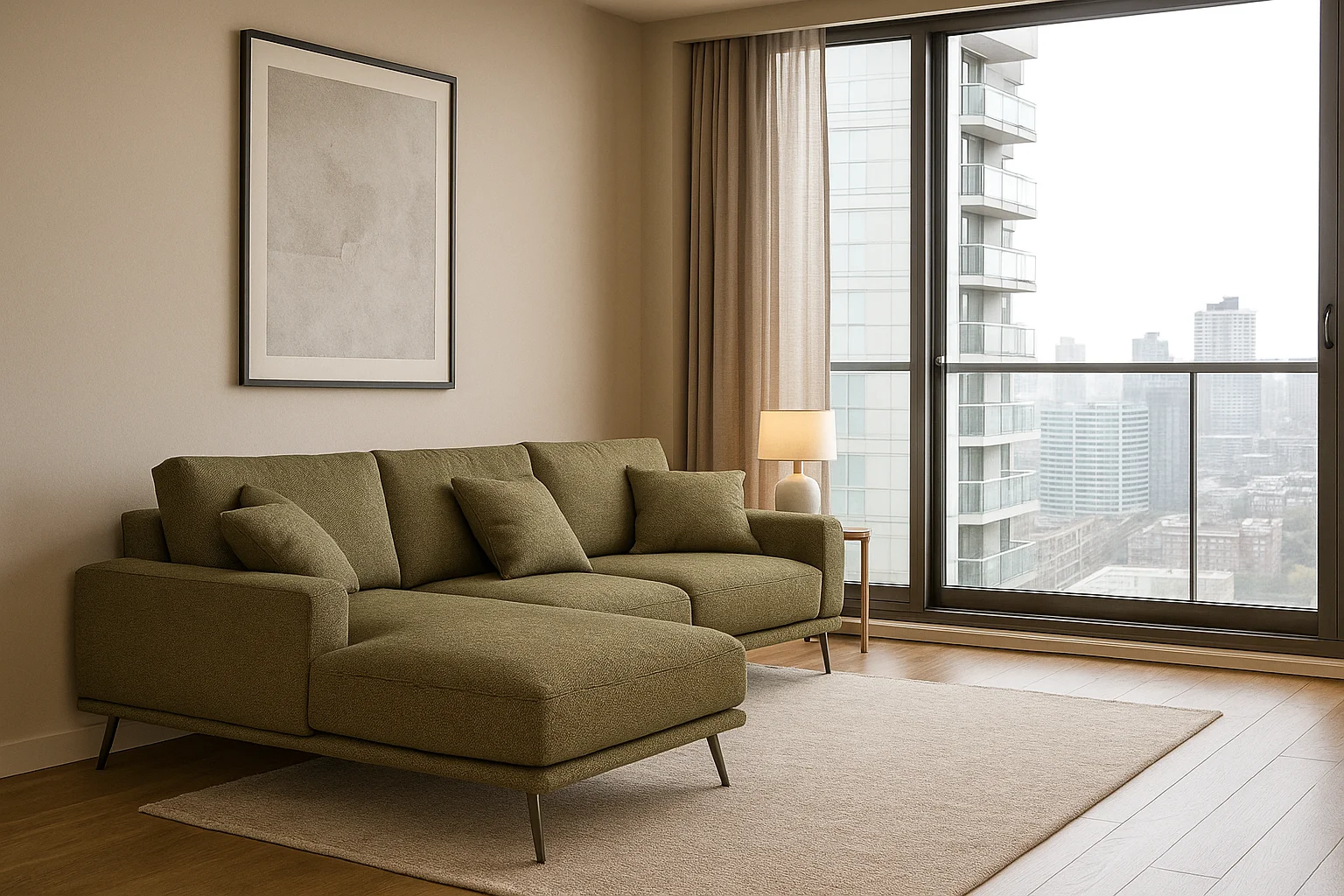 Soft yet durable fabric in a warm olive tone adds a natural, cozy vibe to modern interiors.
